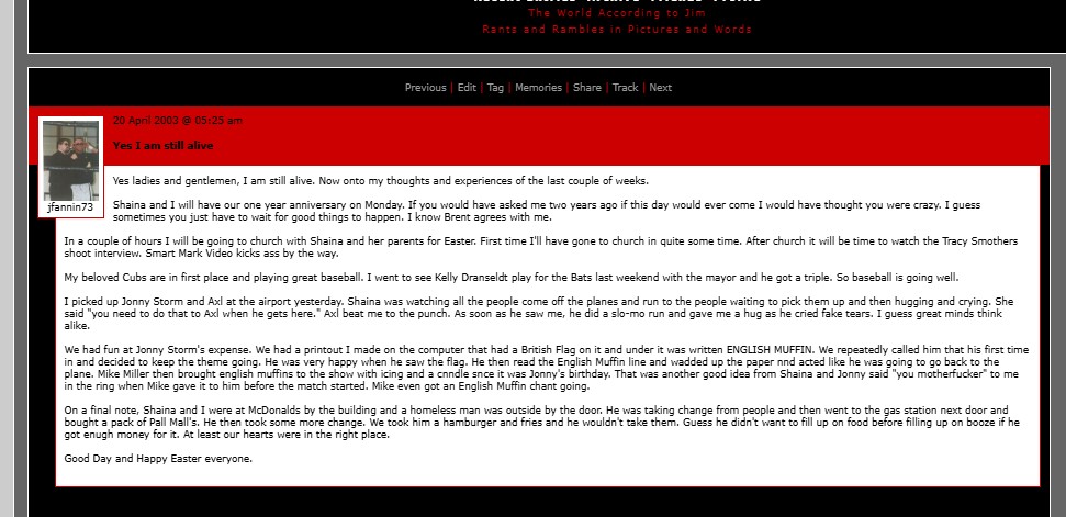 In a couple of hours I will be going to church with Shaina and her parents for Easter. First time I’ll have gone to church in quite some time. After church it will be time to watch the Tracy Smothers shoot interview. Smart Mark Video kicks ass by the way.