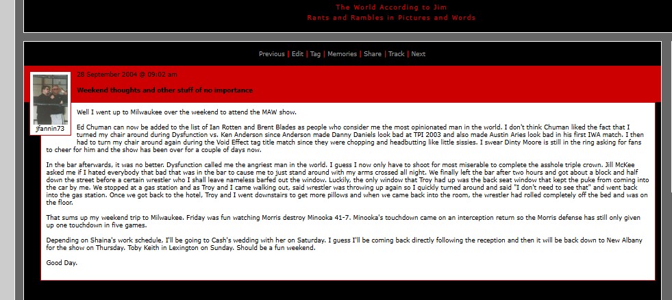 In the bar afterwards, it was no better. Dysfunction called me the angriest man in the world. I guess I now only have to shoot for most miserable to complete the asshole triple crown. Jill McKee asked me if I hated everybody that bad that was in the bar to cause me to just stand around with my arms crossed all night. We finally left the bar after two hours and got about a block and half down the street before a certain wrestler who I shall leave nameless barfed out the window. Luckily, the only window that Troy had up was the back seat window that kept the puke from coming into the car by me. We stopped at a gas station and as Troy and I came walking out, said wrestler was throwing up again so I quickly turned around and said “I don’t need to see that” and went back into the gas station. Once we got back to the hotel, Troy and I went downstairs to get more pillows and when we came back into the room, the wrestler had rolled completely off the bed and was on the floor.