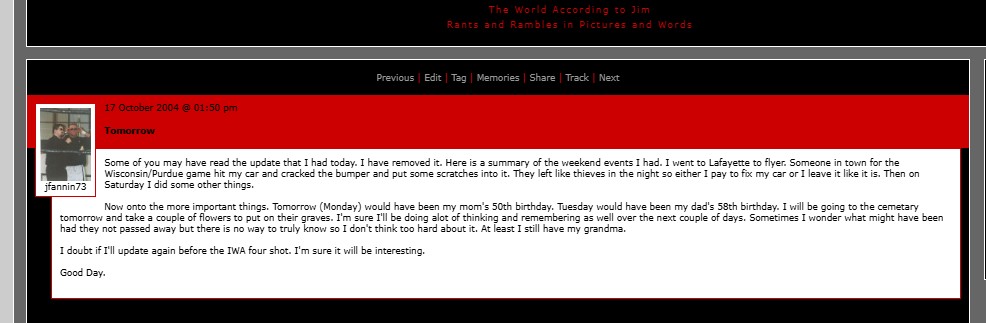 Some of you may have read the update that I had today. I have removed it. Here is a summary of the weekend events I had. I went to Lafayette to flyer. Someone in town for the Wisconsin/Purdue game hit my car and cracked the bumper and put some scratches into it. They left like thieves in the night so either I pay to fix my car or I leave it like it is. Then on Saturday I did some other things.