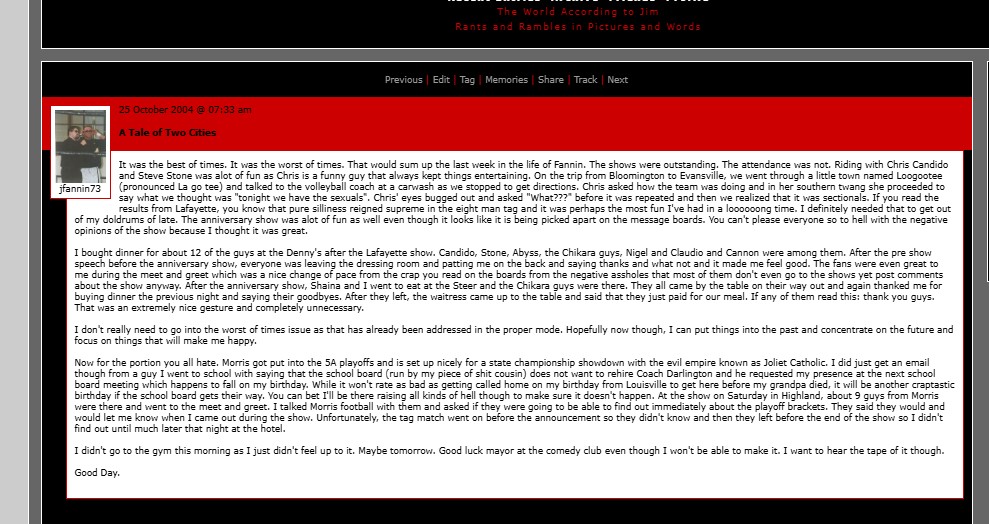 It was the best of times. It was the worst of times. That would sum up the last week in the life of Fannin. The shows were outstanding. The attendance was not. Riding with Chris Candido and Steve Stone was alot of fun as Chris is a funny guy that always kept things entertaining. On the trip from Bloomington to Evansville, we went through a little town named Loogootee (pronounced La go tee) and talked to the volleyball coach at a carwash as we stopped to get directions. Chris asked how the team was doing and in her southern twang she proceeded to say what we thought was “tonight we have the sexuals”. Chris’ eyes bugged out and asked “What???” before it was repeated and then we realized that it was sectionals. If you read the results from Lafayette, you know that pure silliness reigned supreme in the eight man tag and it was perhaps the most fun I’ve had in a loooooong time. I definitely needed that to get out of my doldrums of late. The anniversary show was alot of fun as well even though it looks like it is being picked apart on the message boards. You can’t please everyone so to hell with the negative opinions of the show because I thought it was great.