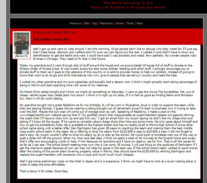 My grandma bought me a great Redskins tie for my birthday. It will be worn in Muscatine, Iowa in order to support the team while they are playing Pontiac. I guess the tie wearing is being brought out of retirement since I’m back to business now in trying to take over the IWA. Maybe the suit coat will come out of storage soon as well. Speaking of Redskins, I made a post on the www.KeepCoachD.com website saying that if “my goofball cousin that masquerades as superintendent speaks out against rehiring the coach then I’ll have to chew him up and spit him out.” I got an email from my cousin saying he didn’t like my cheap shot and asking if I knew all the issues. If he wants to complain about cheap shots then here are some more. He only cares about himself and how to get his pocketbook fuller. He is available to the highest bidder and has no loyalty at all to Morris High School if some other school came along with a better offer. Dan Darlington has given 28 years to coaching the team and making them the best middle class public school team in the state. He is offering to drop his salary from $132,000 a year to $10,000 a year. I did not forget to add a zero. My cousin wouldn’t offer to drop his salary by $1 to stay at the school. He would push a homeless man out of the way to grab a dollar bill off the ground. When my mom and dad died, I think he spent a total of 10 minutes at the funeral home and surely didn’t offer any encouraging words or help. F him because my grandma and I have no need or use for him. That is all the issues for as far as I can see. The school board meeting may turn into a war zone. Of course, I will just focus on the positives of Darlington if I get the chance to speak because all out war may not help his cause in the best way. If the school board really wanted to save money after the closing of the power plant lowering property value in Morris, they should save the $120,000 by rehiring Darlington and replace the superintendent with someone who is loyal and much much much cheaper.