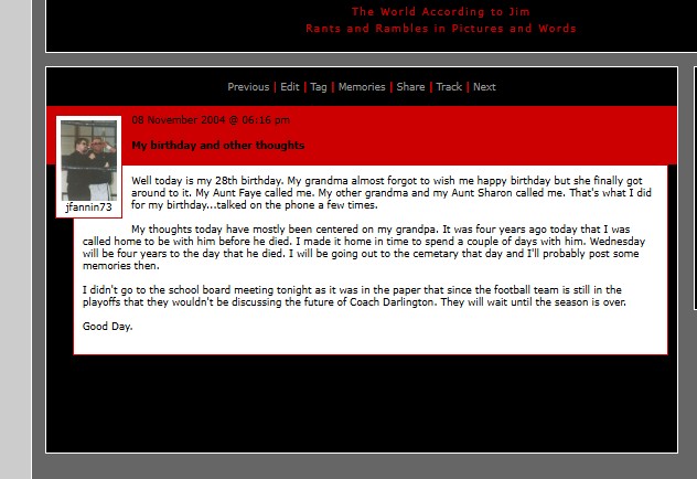 Well today is my 28th birthday. My grandma almost forgot to wish me happy birthday but she finally got around to it. My Aunt Faye called me. My other grandma and my Aunt Sharon called me. That’s what I did for my birthday…talked on the phone a few times.