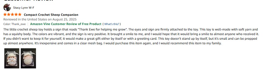 I purchased the WULNATIBMER Mini Handmade Yarn Decor – Compact Crochet Sheep Companion for Positivity, Encouragement, and Home or Office Display from Amazon and it was delivered in a timely fashion. The little crochet sheep toy holds a sign that reads “Thank Ewe for helping me grow”. The eyes and sign are firmly attached to the toy. This toy is well-made with soft yarn and has a squishy body. The colors are vibrant, and the sign is very positive. It brought a smile to me, and I would hope that it would bring a smile to almost anyone who received it. If you didn’t want to keep it for yourself, it would make a great gift either by itself or with a greeting card. This toy doesn’t stand up by itself, but it’s small and can be propped up almost anywhere. It’s inexpensive and comes in a clear mesh bag. I would purchase this item again, and I would recommend this item to my family. amazon listing.