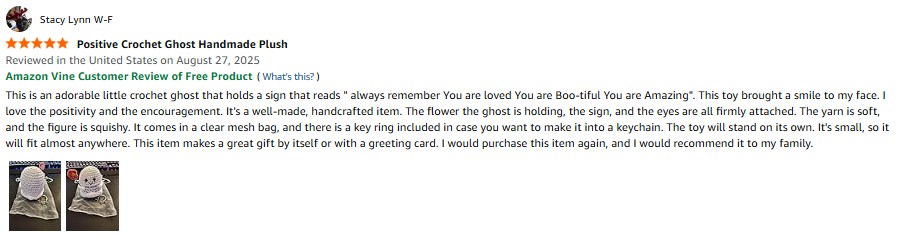 Frabaca You are Loved – Positive Crochet Ghost Handmade Plush with Affirmation Card Saying, Inspirational Emotion Support Spooky Items for Birthday, Halloween Boo Basket Christmas Stocking Stuffers Amazon Review