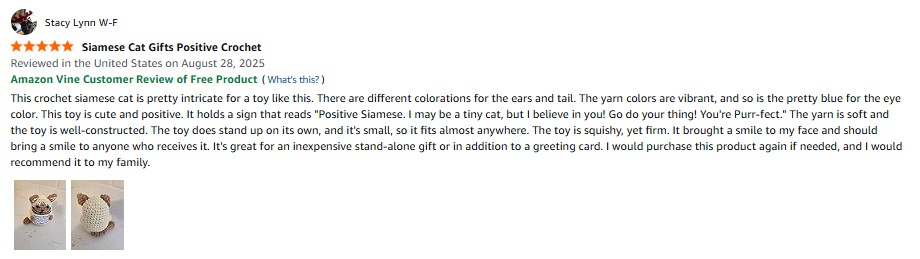 I purchased the AICase Siamese Cat Gifts Positive Crochet Animals, Emotional Support Nuggets Funny Cat Lover Gifts for Women Men Mom Dad Birthday Christmas Stocking Stuffers Cute Themed Decor Stuff Merch from Amazon and it was delivered in a timely fashion. This crochet siamese cat is pretty intricate for a toy like this. There are different colorations for the ears and tail. The yarn colors are vibrant, and so is the pretty blue for the eye color. This toy is cute and positive. It holds a sign that reads “Positive Siamese. I may be a tiny cat, but I believe in you! Go do your thing! You’re Purr-fect.” The yarn is soft and the toy is well-constructed. The toy does stand up on its own, and it’s small, so it fits almost anywhere. The toy is squishy, yet firm. It brought a smile to my face and should bring a smile to anyone who receives it. It’s great for an inexpensive stand-alone gift or in addition to a greeting card. I would purchase this product again if needed, and I would recommend it to my family. amazon listing.