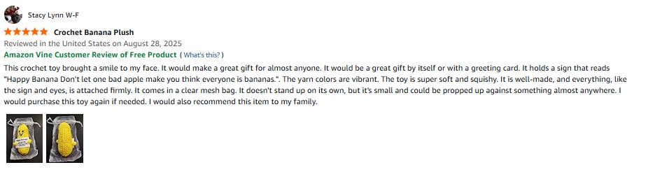 I purchased the MAMAGIFTREE Crochet Banana Plush Positive Inspirational Gift for Friends, Coworkers, Girlfriend, Boyfriend – Cute Handmade Knitted Stress Relief Toy,Fun Birthday, Friendship, Encouragement Desk Decor from Amazon and it was delivered in a timely fashion. This crochet toy brought a smile to my face. It would make a great gift for almost anyone. It would be a great gift by itself or with a greeting card. It holds a sign that reads “Happy Banana Don’t let one bad apple make you think everyone is bananas.”. The yarn colors are vibrant. The toy is super soft and squishy. It is well-made, and everything, like the sign and eyes, is attached firmly. It comes in a clear mesh bag. It doesn’t stand up on its own, but it’s small and could be propped up against something almost anywhere. I would purchase this toy again if needed. I would also recommend this item to my family. amazon listing.