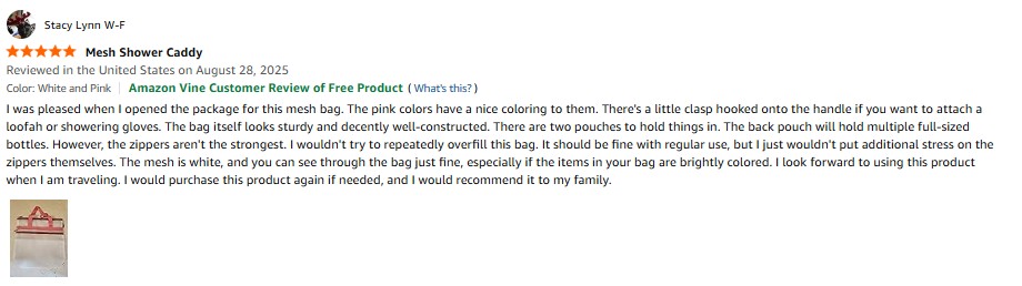 I purchased the S&T INC. Mesh Shower Caddy, Shower Bag for Dorm Room Essentials, Gym Bag, Camping and More, Two Zippered Pockets, White and Pink, 10 Inches x 10 Inches from Amazon and it was delivered in a timely fashion. I was pleased when I opened the package for this mesh bag. The pink colors have a nice coloring to them. There’s a little clasp hooked onto the handle if you want to attach a loofah or showering gloves. The bag itself looks sturdy and decently well-constructed. There are two pouches to hold things in. The back pouch will hold multiple full-sized bottles. However, the zippers aren’t the strongest. I wouldn’t try to repeatedly overfill this bag. It should be fine with regular use, but I just wouldn’t put additional stress on the zippers themselves. The mesh is white, and you can see through the bag just fine, especially if the items in your bag are brightly colored. I look forward to using this product when I am traveling. I would purchase this product again if needed, and I would recommend it to my family. amazon listing.