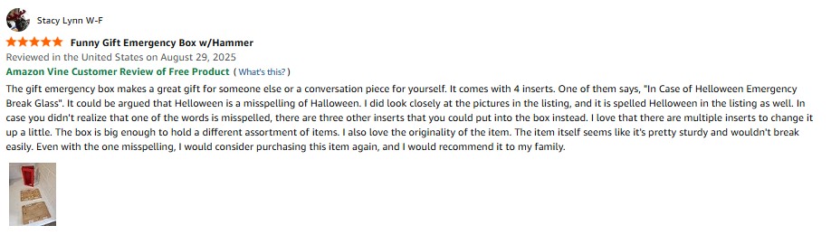 I purchased the KHJCXS Funny Gift Emergency Box w/Hammer, In Case of Emergency Break Glass Boxes, 4 Types of Replacement, Halloween hilarious Desk Decor, White Elephant Gift and Gag Gifts for Friend Coworker Family from Amazon and it was delivered in a timely fashion. The gift emergency box makes a great gift for someone else or a conversation piece for yourself. It comes with 4 inserts. One of them says, “In Case of Helloween Emergency Break Glass”. It could be argued that Helloween is a misspelling of Halloween. I did look closely at the pictures in the listing, and it is spelled Helloween in the listing as well. In case you didn’t realize that one of the words is misspelled, there are three other inserts that you could put into the box instead. I love that there are multiple inserts to change it up a little. The box is big enough to hold a different assortment of items. I also love the originality of the item. The item itself seems like it’s pretty sturdy and wouldn’t break easily. Even with the one misspelling, I would consider purchasing this item again, and I would recommend it to my family. amazon listing.