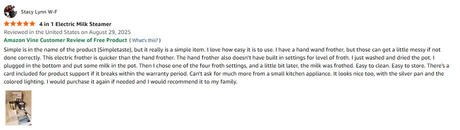 I purchased the SIMPLETASTE Milk Frother, 4 in 1 Electric Milk Steamer , 16.91oz/500ml Automatic Warm and Cold Foam Frother for Coffee, Latte, Macchiato, Cappuccino, Hot Chocolate from Amazon and it was delivered in a timely fashion. Simple is in the name of the product (Simpletaste), but it really is a simple item. I love how easy it is to use. I have a hand wand frother, but those can get a little messy if not done correctly. This electric frother is quicker than the hand frother. The hand frother also doesn’t have built-in settings for the level of froth. I just washed and dried the pot. I plugged in the bottom and put some milk in the pot. Then I chose one of the four froth settings, and a little bit later, the milk was frothed. Easy to clean. Easy to store. There’s a card included for product support if it breaks within the warranty period. Can’t ask for much more from a small kitchen appliance. It looks nice too, with the silver pan and the colored lighting. I would purchase it again if needed, and I would recommend it to my family. amazon listing.