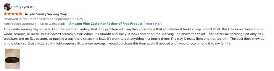 I purchased the KEVJES Acrylic Vanity Serving Tray –14″x8.5″ Decorative Capsule Shape Tray for Bathroom, Dresser, Coffee Table – Sleek Minimalist Lucite Tray for Perfume, Jewelry, Makeup Organizer (1, Glossy Black) from Amazon and it was delivered in a timely fashion. This vanity serving tray is perfect for the use that I anticipated. The problem with anything plasticy is that sometimes it looks cheap. I don’t think this tray looks cheap. It’s not wood, ceramic, or metal, but it doesn’t scream plastic either. It’s smooth and shiny. It looks decent on the shelving unit above the toilet. That particular shelving unit only has crossbars and no flat bottom, so putting a tray there solves the issue if I want to put anything in a bottle there. The tray is really light and not too thin. The dust does show up on the black surface a little, so it might require a little more upkeep. I would purchase this item again if needed and I would recommend it to my family. amazon listing.