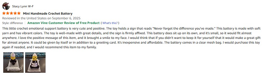 I purchased the AVBODA Mini Retirement Gift for Woman Men Coworkers Back to School Teacher Appreciation Gifts Handmade Crochet Battery Leaving Goodbye Going Away Farewell Gifts for Coworkers Friends Christmas White Elephant from Amazon and it was delivered in a timely fashion. This little crochet emotional support battery is very cute and positive. The toy holds a sign that reads “Never forget the difference you’ve made.” This battery is made with soft yarn and has vibrant colors. The toy is well-made with great details, and the sign is firmly affixed. This battery does sit up on its own, and it’s small, so it would fit almost anywhere. I love the positive message of this item, and it brought a smile to my face. I would think that if you didn’t want to keep it for yourself that it would make a great gift for almost anyone. It could be given by itself or in addition to a greeting card. It’s inexpensive and affordable. The battery comes in a clear mesh bag. I would purchase this toy again if needed, and I would recommend this item to my family. amazon listing.