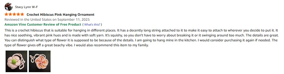 I purchased the Brliantux Crochet Hibiscus Pink Flower Car Rear View Mirror Hanging Ornament Tropical Flowers Women Bag Charms Summer Beach Decoration from Amazon and it was delivered in a timely fashion. This is a crochet hibiscus that is suitable for hanging in different places. It has a decently long string attached to it to make it easy to attach to wherever you decide to put it. It has nice soothing, vibrant pink hues and is made with soft yarn. It’s squishy, so you don’t have to worry about breaking it or it swinging around too much. The details are great. You can distinguish what type of flower it is supposed to be because of the details. I am going to hang mine in the kitchen. I would consider purchasing it again if needed. The type of flower gives off a great beachy vibe. I would also recommend this item to my family.amazon listing.