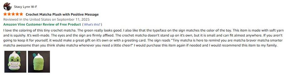 I purchased the LushSpring Crochet Matcha Plush with Positive Message , Birthday Gift for Women, Friend, Bestie, Coworker, Boss Lady, Emotional Support Office Home Decor Matcha Gift, Appreciation for Christmas Stocking Stuffer from Amazon and it was delivered in a timely fashion. I love the coloring of this tiny crochet matcha. The green really looks good. I also like that the typeface on the sign matches the color of the toy. This item is made with soft yarn and is squishy. It’s well-made. The eyes and the sign are firmly affixed. The crochet matcha doesn’t stand up on its own, but it is small and can fit almost anywhere. If you aren’t going to keep it for yourself, it would make a great gift on its own or with a greeting card. The sign reads “Tiny matcha is here to remind you are matcha braver matcha smarter matcha awesome than you think. Shake matcha whenever you need a little cheer!” I would purchase this item again if needed, and I would recommend this item to my family. amazon listing.