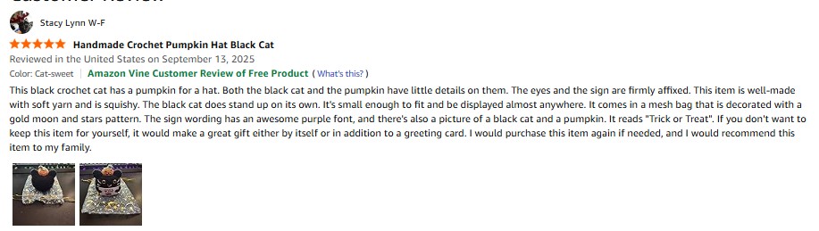 I purchased the hixkvpen Black Cat Halloween Decorations Indoor Gifts Happy Halloween Boo Basket Party Favors for Student Friend Women Men Trick Or Treat Fall Decor for Home Handmade Crochet Pumpkin Hat Black Cat from Amazon and it was delivered in a timely fashion. This black crochet cat has a pumpkin for a hat. Both the black cat and the pumpkin have little details on them. The eyes and the sign are firmly affixed. This item is well-made with soft yarn and is squishy. The black cat does stand up on its own. It’s small enough to fit and be displayed almost anywhere. It comes in a mesh bag that is decorated with a gold moon and stars pattern. The sign wording has an awesome purple font, and there’s also a picture of a black cat and a pumpkin. It reads “Trick or Treat”. If you don’t want to keep this item for yourself, it would make a great gift either by itself or in addition to a greeting card. I would purchase this item again if needed, and I would recommend this item to my family. amazon listing.