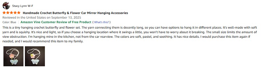 I purchased the Linsdala Handmade Crochet Butterfly & Flower Car Mirror Hanging Accessories – Cute Boho Cars Decor for Women, Girly Summer Vibes Rear View Mirror Charm, Floral Car Interior Ornament & Decoration Gift (Blue) from Amazon and it was delivered in a timely fashion. This is a tiny hanging crochet butterfly and flower set. The yarn connecting them is decently long, so you can have options to hang it in different places. It’s well-made with soft yarn and is squishy. It’s nice and light, so if you choose a hanging location where it swings a little, you won’t have to worry about it breaking. The small size limits the amount of view obstruction. I’m hanging mine in the kitchen, not from the car rearview. The colors are soft, pastel, and soothing. It has nice details. I would purchase this item again if needed, and I would recommend this item to my family. amazon listing.