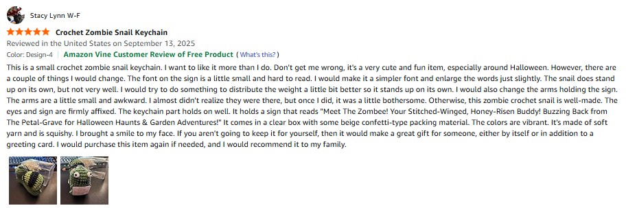I purchased the OCOUYVD Crochet Zombie Snail Keychain, Knitted Keychains for Women, Cute Kawaii Keychain Backpack Handmade Crochet Knitting for Halloween from Amazon and it was delivered in a timely fashion. This is a small crochet zombie snail keychain. I want to like it more than I do. Don’t get me wrong, it’s a very cute and fun item, especially around Halloween. However, there are a couple of things I would change. The font on the sign is a little small and hard to read. I would make it a simpler font and enlarge the words just slightly. The snail does stand up on its own, but not very well. I would try to do something to distribute the weight a little bit better so it stands up on its own. I would also change the arms holding the sign. The arms are a little small and awkward. I almost didn’t realize they were there, but once I did, it was a little bothersome. Otherwise, this zombie crochet snail is well-made. The eyes and sign are firmly affixed. The keychain part holds on well. It holds a sign that reads “Meet The Zombee! Your Stitched-Winged, Honey-Risen Buddy! Buzzing Back from The Petal-Grave for Halloween Haunts & Garden Adventures!” It comes in a clear box with some beige confetti-type packing material. The colors are vibrant. It’s made of soft yarn and is squishy. I brought a smile to my face. If you aren’t going to keep it for yourself, then it would make a great gift for someone, either by itself or in addition to a greeting card. I would purchase this item again if needed, and I would recommend it to my family. amazon listing.