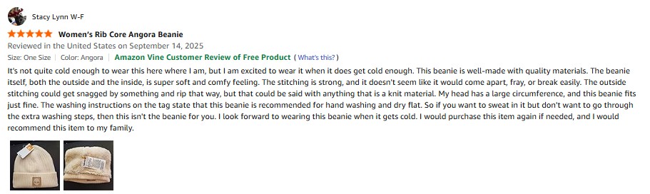 I purchased the Timberland Women’s Rib Core Angora Beanie – Soft Knit Winter Hat, Stretch Fit, Ribbed Texture, Fold-Over Cuff for Cold Weather from Amazon and it was delivered in a timely fashion. It’s not quite cold enough to wear this here where I am, but I am excited to wear it when it does get cold enough. This beanie is well-made with quality materials. The beanie itself, both the outside and the inside, is super soft and comfy feeling. The stitching is strong, and it doesn’t seem like it would come apart, fray, or break easily. The outside stitching could get snagged by something and rip that way, but that could be said with anything that is a knit material. My head has a large circumference, and this beanie fits just fine. The washing instructions on the tag state that this beanie is recommended for hand washing and dry flat. So if you want to sweat in it but don’t want to go through the extra washing steps, then this isn’t the beanie for you. I look forward to wearing this beanie when it gets cold. I would purchase this item again if needed, and I would recommend this item to my family.amazon listing.