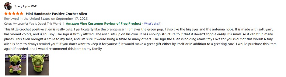 I purchased the WoollyPearl Mini Handmade Positive Crochet Alien , Gifts for Him Her Boyfriend Girlfriend, Emotional Support Anniversary Birthday I Love You Gifts for Women Men Wife Husband Mom Dad Daughter Friends Loved Ones from Amazon and it was delivered in a timely fashion. This little crochet positive alien is really cute. I particularly like the orange scarf. It makes the green pop. I also like the big eyes and the antenna nobs. It is made with soft yarn, has vibrant colors, and is squishy. The sign is firmly affixed. The alien sits up on his own. It has enough structure to it that it doesn’t topple easily. It’s small so that it can fit in many places. This alien brought a smile to my face, and I’m sure it would bring a smile to many others. The sign the alien is holding reads “My Love for you is out of this world! A tiny alien is here to always remind you!” If you don’t want to keep it for yourself, it would make a great gift either by itself or in addition to a greeting card. I would purchase this item again if needed, and I would recommend this item to my family. amazon listing.