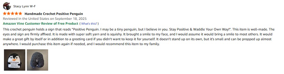 I purchased the Litter Star Adult Handmade Crochet Penguin Gift for Couples – Anniversary, Birthday, Romantic Love Token for Husband Wife (Positive) from Amazon and it was delivered in a timely fashion. This crochet penguin holds a sign that reads “Positive Penguin. I may be a tiny penguin, but I believe in you. Stay Positive & Waddle Your Own Way!”. This item is well-made. The eyes and sign are firmly affixed. It is made with super soft yarn and is squishy. It brought a smile to my face, and I would assume it would bring a smile to most others. It would make a great gift by itself or in addition to a greeting card if you didn’t want to keep it for yourself. It doesn’t stand up on its own, but it’s small and can be propped up almost anywhere. I would purchase this item again if needed, and I would recommend this item to my family. amazon listing.