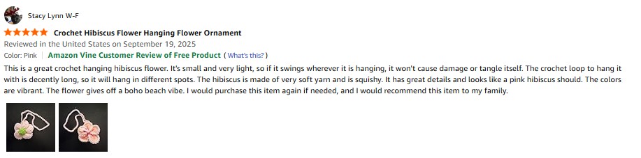 I purchased the Oudome Car Decor Rear View Mirror Accessories, Crochet Hibiscus Flower Car Mirror Hanging Accessories , Bag Charms Cute Hawaiian Tropical Flower Ornament(Pink) from Amazon and it was delivered in a timely fashion. This is a great crochet hanging hibiscus flower. It’s small and very light, so if it swings wherever it is hanging, it won’t cause damage or tangle itself. The crochet loop to hang it with is decently long, so it will hang in different spots. The hibiscus is made of very soft yarn and is squishy. It has great details and looks like a pink hibiscus should. The colors are vibrant. The flower gives off a boho beach vibe. I would purchase this item again if needed, and I would recommend this item to my family. amazon listing.