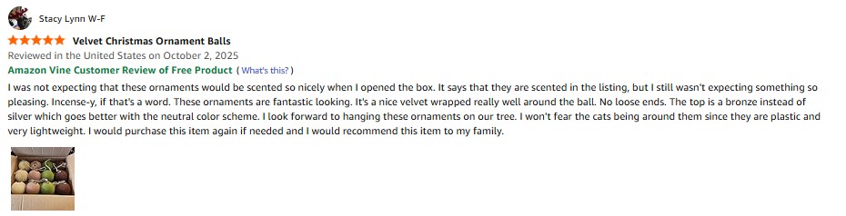 I purchased the Bornerwhite 12PCS Velvet Christmas Balls Ornament Shatterproof Velvet Xmas Tree Baubles Hanging Pendant for Winter Party Holiday Home Gift Office Yard Decor(Brown, Green, Coffee, Beige,3.15”) from Amazon and it was delivered in a timely fashion. I was not expecting that these ornaments would be scented so nicely when I opened the box. It says that they are scented in the listing, but I still wasn’t expecting something so pleasing. Incense-y, if that’s a word. These ornaments are fantastic looking. It’s a nice velvet wrapped really well around the ball. No loose ends. The top is a bronze instead of silver which goes better with the neutral color scheme. I look forward to hanging these ornaments on our tree. I won’t fear the cats being around them since they are plastic and very lightweight. I would purchase this item again if needed and I would recommend this item to my family. amazon listing.
