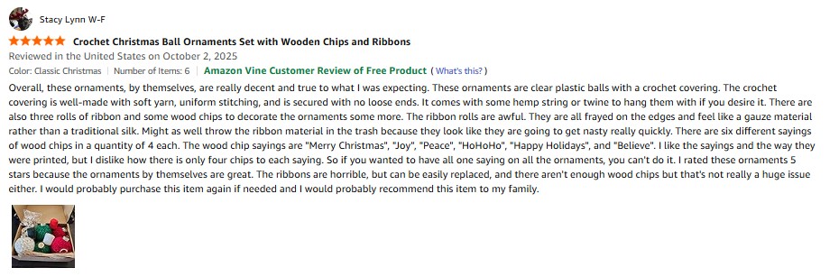 I purchased the EYNDYN 6 Pcs 3.15″ Crochet Christmas Ball Ornaments Set with Wooden Chips and Ribbons Classic Red Green White Knitted Hanging Balls for Neutral Rustic Farmhouse Christmas Tree Holiday Xmas Decoration from Amazon and it was delivered in a timely fashion. Overall, these ornaments, by themselves, are really decent and true to what I was expecting. These ornaments are clear plastic balls with a crochet covering. The crochet covering is well-made with soft yarn, uniform stitching, and is secured with no loose ends. It comes with some hemp string or twine to hang them with if you desire it. There are also three rolls of ribbon and some wood chips to decorate the ornaments some more. The ribbon rolls are awful. They are all frayed on the edges and feel like a gauze material rather than a traditional silk. Might as well throw the ribbon material in the trash because they look like they are going to get nasty really quickly. There are six different sayings of wood chips in a quantity of 4 each. The wood chip sayings are “Merry Christmas”, “Joy”, “Peace”, “HoHoHo”, “Happy Holidays”, and “Believe”. I like the sayings and the way they were printed, but I dislike how there is only four chips to each saying. So if you wanted to have all one saying on all the ornaments, you can’t do it. I rated these ornaments 5 stars because the ornaments by themselves are great. The ribbons are horrible, but can be easily replaced, and there aren’t enough wood chips but that’s not really a huge issue either. I would probably purchase this item again if needed and I would probably recommend this item to my family. amazon listing.