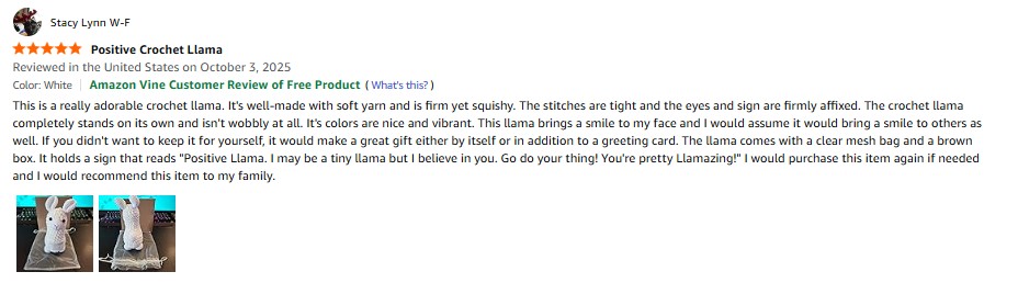 I purchased the HEALDOT Cute Positive Crochet Animals Llama , Emotional Support Cheer Gift Christmas Birthday Gifts for Women Men Friends Mum Daughter, Inspirational Handmade Cute Stuff Things, Home Accessories Decor (White) from Amazon and it was delivered in a timely fashion. This is a really adorable crochet llama. It’s well-made with soft yarn and is firm yet squishy. The stitches are tight and the eyes and sign are firmly affixed. The crochet llama completely stands on its own and isn’t wobbly at all. It’s colors are nice and vibrant. This llama brings a smile to my face and I would assume it would bring a smile to others as well. If you didn’t want to keep it for yourself, it would make a great gift either by itself or in addition to a greeting card. The llama comes with a clear mesh bag and a brown box. It holds a sign that reads “Positive Llama. I may be a tiny llama but I believe in you. Go do your thing! You’re pretty Llamazing!” I would purchase this item again if needed and I would recommend this item to my family. amazon listing.