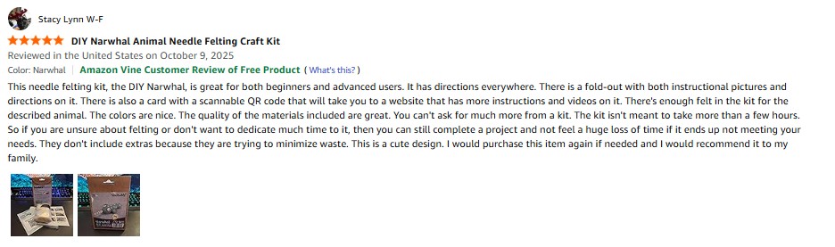 I purchased the Woolbuddy Needle Felting Kit for Beginners & Adults – DIY Narwhal Animal Craft Kit – Complete Starter Set with Wool, Needles & Step-by-Step Instructions from Amazon and it was delivered in a timely fashion. This needle felting kit, the DIY Narwhal, is great for both beginners and advanced users. It has directions everywhere. There is a fold-out with both instructional pictures and directions on it. There is also a card with a scannable QR code that will take you to a website that has more instructions and videos on it. There’s enough felt in the kit for the described animal. The colors are nice. The quality of the materials included are great. You can’t ask for much more from a kit. The kit isn’t meant to take more than a few hours. So if you are unsure about felting or don’t want to dedicate much time to it, then you can still complete a project and not feel a huge loss of time if it ends up not meeting your needs. They don’t include extras because they are trying to minimize waste. This is a cute design. I would purchase this item again if needed and I would recommend it to my family. amazon listing.