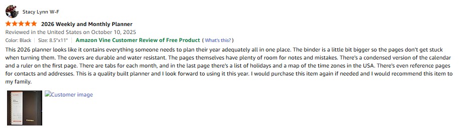 I purchased the SUNEE 2026 Weekly and Monthly Planner – January 2026-December 2026, 8.5″x11″ Half Weekly Half Note, Daily Agenda Planner with PVC Waterproof Cover, Monthly Tab, Note, Pockets, Bookmark, Black from Amazon and it was delivered in a timely fashion. This 2026 planner looks like it contains everything someone needs to plan their year adequately all in one place. The binder is a little bit bigger so the pages don’t get stuck when turning them. The covers are durable and water resistant. The pages themselves have plenty of room for notes and mistakes. There’s a condensed version of the calendar and a ruler on the first page. There are tabs for each month, and in the last page there’s a list of holidays and a map of the time zones in the USA. There’s even reference pages for contacts and addresses. This is a quality built planner and I look forward to using it this year. I would purchase this item again if needed and I would recommend this item to my family. amazon listing.