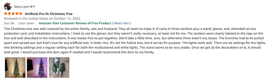 I purchased the Garvee 6FT Christmas Tree , Artificial Pre-lit Pencil Tree, Easy Assemble, Xmas Decor for Home Party Office Mall Holiday from Amazon and it was delivered in a timely fashion. This Christmas tree was well-received by the entire family, cats and husband. They all seem to enjoy it. It came in three sections plus a stand, gloves, and, extended service protection card, and installation instructions. I tried to use the gloves, but they weren’t really necessary, at least not for me. The sections were clearly labeled in the tags on the tree and well described in the instructions. It was hassle-free to put together. Did it take a little time, sure, but otherwise there wasn’t any issues. The branches had to be pulled apart and spread out, but that’s true for any artificial tree. It looks nice. It’s not the fullest tree, but it serves it’s purpose. The lights work well. There are six settings for the lights, two blinking settings and a regular setting each for both the multicolored and white lights. The stand seems to be very stable. Once we get all the decorations on it, it should look great. I would purchase this item again if needed and I would recommend this item to my family. amazon listing.