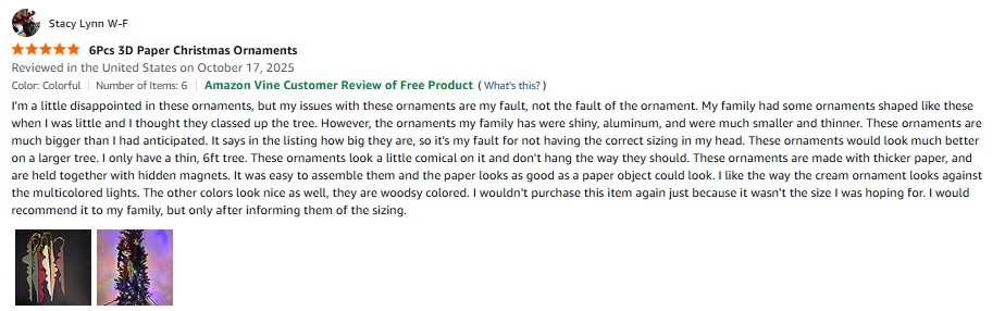 I purchased the OuMuaMua 6Pcs Finial Christmas Ornaments for Tree , 3D Paper Honeycomb Hanging Decorations Neutral Boho Christmas Honeycomb Ornaments Lanterns for Xmas Tree Winter Wedding New Year Holiday Party Home Decor from Amazon and it was delivered in a timely fashion. I’m a little disappointed in these ornaments, but my issues with these ornaments are my fault, not the fault of the ornament. My family had some ornaments shaped like these when I was little and I thought they classed up the tree. However, the ornaments my family has were shiny, aluminum, and were much smaller and thinner. These ornaments are much bigger than I had anticipated. It says in the listing how big they are, so it’s my fault for not having the correct sizing in my head. These ornaments would look much better on a larger tree. I only have a thin, 6ft tree. These ornaments look a little comical on it and don’t hang the way they should. These ornaments are made with thicker paper, and are held together with hidden magnets. It was easy to assemble them and the paper looks as good as a paper object could look. I like the way the cream ornament looks against the multicolored lights. The other colors look nice as well, they are woodsy colored. I wouldn’t purchase this item again just because it wasn’t the size I was hoping for. I would recommend it to my family, but only after informing them of the sizing. amazon listing.