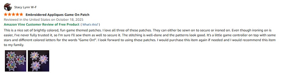 I purchased the Xystrulkn Funny Game On Patch – Colorful Iron On Embroidered for Backpacks Jeans Jackets Hats & Clothes Cute Funny Cool Embroidered Appliques Patch 2PC from Amazon and it was delivered in a timely fashion. This is a nice set of brightly colored, fun game themed patches. I love all three of these patches. They can either be sewn on to secure or ironed on. Even though ironing on is easier, I’ve never fully trusted it, so I’m sure I’ll sew them as well to secure it. The stitching is well-done and the patterns look good. It’s a little game controller on top with some stars and different colored letters for the words “Game On!”. I look forward to using these patches. I would purchase this item again if needed and I would recommend this item to my family. amazon listing.