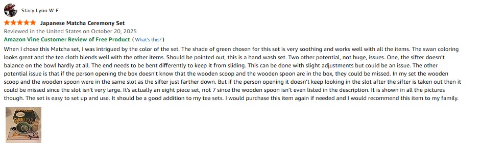 I purchased the Qimei Japanese Matcha Ceremony Accessory, Matcha Whisk, Tea Spoon, Whisk Holder, 1 tea bowl, 1 tea siev, The Perfect Set to Prepare a Traditional Cup of Matcha. Christmas, birthday, Halloween gifts from Amazon and it was delivered in a timely fashion. When I chose this Matcha set, I was intrigued by the color of the set. The shade of green chosen for this set is very soothing and works well with all the items. The swan coloring looks great and the tea cloth blends well with the other items. Should be pointed out, this is a hand wash set. Two other potential, not huge, issues. One, the sifter doesn’t balance on the bowl hardly at all. The end needs to be bent differently to keep it from sliding. This can be done with slight adjustments but could be an issue. The other potential issue is that if the person opening the box doesn’t know that the wooden scoop and the wooden spoon are in the box, they could be missed. In my set the wooden scoop and the wooden spoon were in the same slot as the sifter just farther down. But if the person opening it doesn’t keep looking in the slot after the sifter is taken out then it could be missed since the slot isn’t very large. It’s actually an eight piece set, not 7 since the wooden spoon isn’t even listed in the description. It is shown in all the pictures though. The set is easy to set up and use. It should be a good addition to my tea sets. I would purchase this item again if needed and I would recommend this item to my family. amazon listing.
