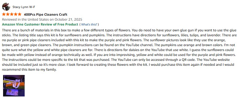I purchased the Vnysh 400Pcs Pipe Cleaners Craft for Flowers – Pipe Cleaners Bulk with 5 Assorted Colors Chenille Stems for DIY Flower Making Kit, Includes Floral Wires, Tape, Stamen and Ribbon(Sunflowers、Pumpkin) from Amazon and it was delivered in a timely fashion. There are a bunch of materials in this box to make a few different types of flowers. You do need to have your own glue gun if you want to use the glue sticks. The listing title says this kit is for sunflowers and pumpkins. The instructions have directions for sunflowers, lilies, tulips, and lavender. There are no purple or pink pipe cleaners included with this kit to make the purple and pink flowers. The sunflower pictures look like they use the orange, brown, and green pipe cleaners. The pumpkin instructions can be found on the YouTube channel. The pumpkins use orange and brown colors. I’m not quite sure what the yellow and white pipe cleaners are for. There is directions for daisies on the YouTube that use white. I guess the sunflowers could be made with yellow instead of orange technically as well. If you are into improvising, yellow and white could be used for the purple and pink flowers. The instructions could be more specific to the kit that was purchased. The YouTube can only be accessed through a QR code. The YouTube website should be included just so it’s more clear. I look forward to creating these flowers with the kit. I would purchase this item again if needed and I would recommend this item to my family. amazon listing.