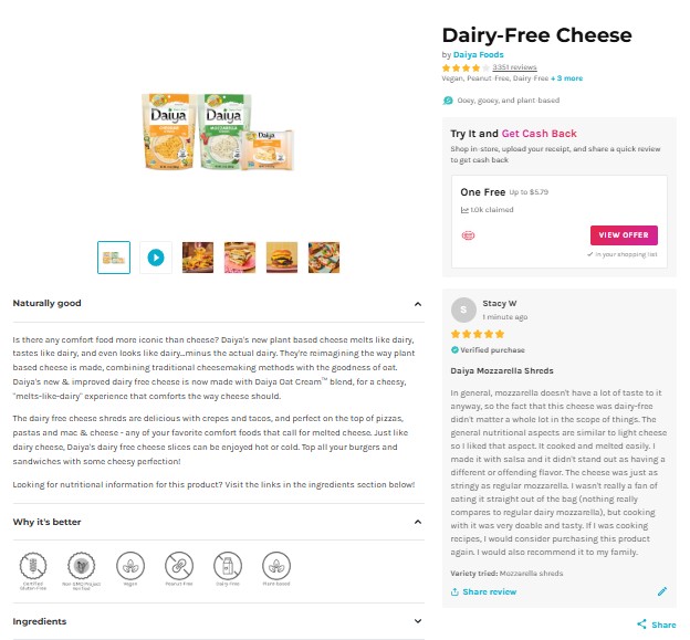 I looked for the Daiya’s Plant-Based Dairy-Free Cheese Mozzarella Shreds at Whole Foods and found it right away. “In general, mozzarella doesn’t have a lot of taste to it anyway, so the fact that this cheese was dairy-free didn’t matter a whole lot in the scope of things. The general nutritional aspects are similar to light cheese so I liked that aspect. It cooked and melted easily. I made it with salsa and it didn’t stand out as having a different or offending flavor. The cheese was just as stringy as regular mozzarella. I wasn’t really a fan of eating it straight out of the bag (nothing really compares to regular dairy mozzarella), but cooking with it was very doable and tasty. If I was cooking recipes, I would consider purchasing this product again. I would also recommend it to my family.”