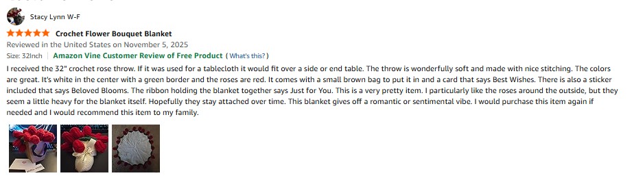 I purchased the CULVE Crochet Flower Bouquet Blanket Finished , Hand Knitted Rose Throw Blankets, 32 Inch Graduation Gifts Sofa Blanket for Wedding Flowers Room Decor from Amazon and it was delivered in a timely fashion. I received the 32″ crochet rose throw. If it was used for a tablecloth it would fit over a side or end table. The throw is wonderfully soft and made with nice stitching. The colors are great. It’s white in the center with a green border and the roses are red. It comes with a small brown bag to put it in and a card that says Best Wishes. There is also a sticker included that says Beloved Blooms. The ribbon holding the blanket together says Just for You. This is a very pretty item. I particularly like the roses around the outside, but they seem a little heavy for the blanket itself. Hopefully they stay attached over time. This blanket gives off a romantic or sentimental vibe. I would purchase this item again if needed and I would recommend this item to my family. amazon listing.