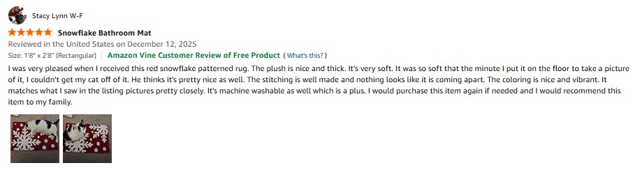 I purchased the REFGY Christmas Bathroom Rug Set , 20×32″ Snowflake Bathroom Mat, Extra Soft & Absorbent, Machine Washable Non Slip Shower Mat, Winter Themed Xmas Plush Bathroom Floor Rug for Holiday Décor Snow Bath Rug from Amazon and it was delivered in a timely fashion. I was very pleased when I received this red snowflake patterned rug. The plush is nice and thick. It’s very soft. It was so soft that the minute I put it on the floor to take a picture of it, I couldn’t get my cat off of it. He thinks it’s pretty nice as well. The stitching is well made and nothing looks like it is coming apart. The coloring is nice and vibrant. It matches what I saw in the listing pictures pretty closely. It’s machine washable as well which is a plus. I would purchase this item again if needed and I would recommend this item to my family. amazon listing.
