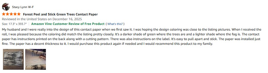 I purchased the EeeComing Forest Peel and Stick Wallpaper Green Trees Wall Paper Woodland Mountain Botanical Contact Paper Waterproof Self-Adhesive Removable Wallpapers Vinyl for Bedroom Bathroom 17.3″ x 393.7″ from Amazon and it was delivered in a timely fashion. My husband and I were really into the design of this contact paper when we first saw it. I was hoping the design coloring was close to the listing pictures. When I received the roll, I was pleased because the coloring did match the listing pretty closely. It’s a darker shade of green where the trees are and a lighter shade where the fog is. The contact paper has instructions printed on the back along with a cutting pattern. There was also instructions on the label. It’s easy to pull apart and stick. The paper was installed just fine. The paper has a decent thickness to it. I would purchase this product again if needed and I would recommend this product to my family. amazon listing.