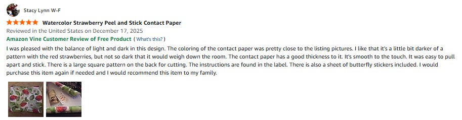 I purchased the EaseStick Watercolor Strawberry Wallpaper Peel and Stick Fruit Wallpaper 17.7″x160″ Prepasted Strawberry Floral Contact Paper for Cabinets Kitchen Nursery Wall Mural Removable Botanical Wall Paper DIY from Amazon and it was delivered in a timely fashion. I was pleased with the balance of light and dark in this design. The coloring of the contact paper was pretty close to the listing pictures. I like that it’s a little bit darker of a pattern with the red strawberries, but not so dark that it would weigh down the room. The contact paper has a good thickness to it. It’s smooth to the touch. It was easy to pull apart and stick. There is a large square pattern on the back for cutting. The instructions are found in the label. There is also a sheet of butterfly stickers included. I would purchase this item again if needed and I would recommend this item to my family. amazon listing.