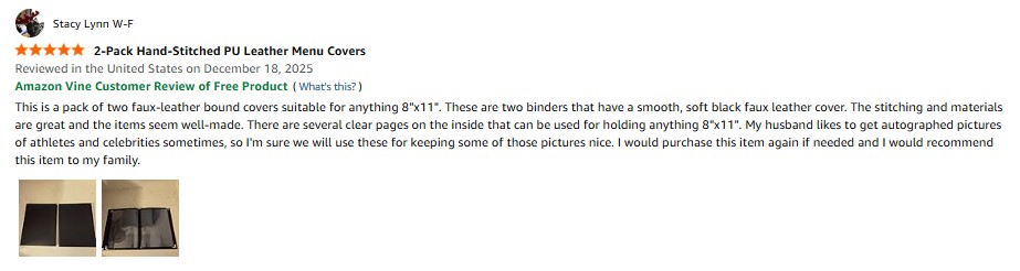 GlimVilo 2-Pack Hand-Stitched PU Leather Menu Covers, Waterproof Faux Leather Folder for Restaurant, Hotel, Salon, Homeschool, Music Sheet, 8.5×11 Inch (Black, 4-Page (8 Views)) Amazon Review