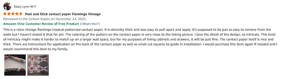 I purchased the Floralplus Peel and Stick Wallpaper Flamingo Vintage Floral Wallpaper Removable Renter Friendly Wallpapers for Bathroom BohoTropical Contact Paper for Countertop Home Decor 17.5 x 118 in from Amazon and it was delivered in a timely fashion. This is a retro vintage flamingo tropical patterned contact paper. It is decently thick and was easy to pull apart and apply. It’s supposed to be just as easy to remove from the walls but I haven’t tested it that far yet. The coloring of the pattern on the contact paper is very close to the listing picture. I love the detail of the design, so intricate. This level of intricacy might make it harder to match up on a larger wall space, but for my purposes of lining cabinets and drawers, it will be just fine. The contact paper itself is nice and thick. There are instructions for application on the back of the contact paper as well as small cut squares to guide in installation. I would purchase this item again if needed and I would recommend this item to my family. amazon listing.
