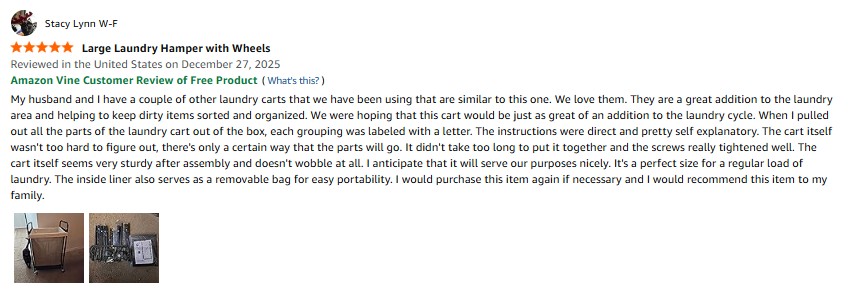 I purchased the STO STO 120L Large Laundry Hamper with Wheels , Rolling Laundry Basket Cart with Removable Canvas Liner Bag, Lockable Wheels, Metal Frame, Dirty Clothes Hamper for Bedroom, Bathroom, Laundry Room from Amazon and it was delivered in a timely fashion. My husband and I have a couple of other laundry carts that we have been using that are similar to this one. We love them. They are a great addition to the laundry area and helping to keep dirty items sorted and organized. We were hoping that this cart would be just as great of an addition to the laundry cycle. When I pulled out all the parts of the laundry cart out of the box, each grouping was labeled with a letter. The instructions were direct and pretty self explanatory. The cart itself wasn’t too hard to figure out, there’s only a certain way that the parts will go. It didn’t take too long to put it together and the screws really tightened well. The cart itself seems very sturdy after assembly and doesn’t wobble at all. I anticipate that it will serve our purposes nicely. It’s a perfect size for a regular load of laundry. The inside liner also serves as a removable bag for easy portability. I would purchase this item again if necessary and I would recommend this item to my family. amazon listing.