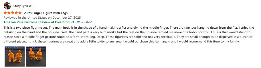 I purchased the Geelin 2 Pcs Finger Figure with Legs Statue 3 Inch Resin Finger Gifts Decor Desk Accessories Figurine Gag Gifts Ornament for Home Office Statue Decoration from Amazon and it was delivered in a timely fashion. This is a two piece figurine set. The main body is in the shape of a hand making a fist and giving the middle finger. There are two legs hanging down from the fist. I enjoy the detailing on the hand and the figurine itself. The hand part is very human-like but the feet on the figurine remind me more of a hobbit or troll. I guess that would stand to reason since a middle finger gesture could be a form of trolling. Deep. These figurines are solid and not very breakable. They are small enough to be displayed in a bunch of different places. I think these figurines are great and add a little levity to any area. I would purchase this item again and I would recommend this item to my family. amazon listing.