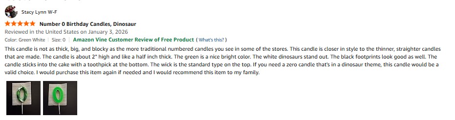 I purchased the KNITCY Number 0 Birthday Candles, Dinosaur Candles Cake Topper for Birthday Decorations, Dinosaur Themed Candle for Boys Girls Cake Decorations, Birthday Party Decor Supplies from Amazon and it was delivered in a timely fashion. This candle is not as thick, big, and blocky as the more traditional numbered candles you see in some of the stores. This candle is closer in style to the thinner, straighter candles that are made. The candle is about 2″ high and like a half inch thick. The green is a nice bright color. The white dinosaurs stand out. The black footprints look good as well. The candle sticks into the cake with a toothpick at the bottom. The wick is the standard type on the top. If you need a zero candle that’s in a dinosaur theme, this candle would be a valid choice. I would purchase this item again if needed and I would recommend this item to my family. amazon listing.