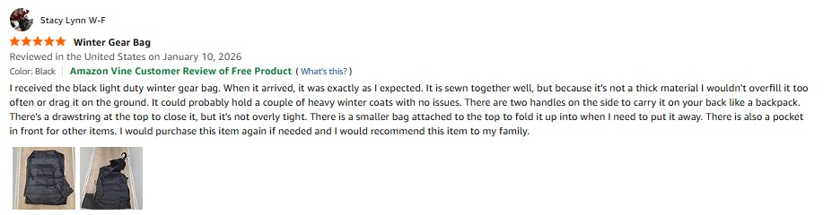 I purchased the MYSUPOT Winter Gear Bag . For Skiing, Snowboarding, Snowshoeing, Ice fishing, Camping – 26″ H x 14″ DIA, 420D Polyester Light Duty from Amazon and it was delivered in a timely fashion. I received the black light duty winter gear bag. When it arrived, it was exactly as I expected. It is sewn together well, but because it’s not a thick material I wouldn’t overfill it too often or drag it on the ground. It could probably hold a couple of heavy winter coats with no issues. There are two handles on the side to carry it on your back like a backpack. There’s a drawstring at the top to close it, but it’s not overly tight. There is a smaller bag attached to the top to fold it up into when I need to put it away. There is also a pocket in front for other items. I would purchase this item again if needed and I would recommend this item to my family. amazon listing.