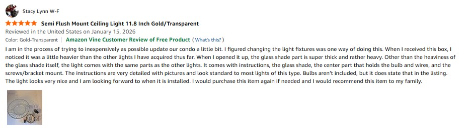 I purchased the Giawosth Semi Flush Mount Ceiling Light ,11.8 Inch Vintage Clear Crystal Glass Ceiling Light Fixture, Dining Room Lighting Fixtures Ceiling for Kitchen Hallway Porch Bedroom Bathroom,E26 Base(Bulb Not Included) from Amazon and it was delivered in a timely fashion. I am in the process of trying to inexpensively as possible update our condo a little bit. I figured changing the light fixtures was one way of doing this. When I received this box, I noticed it was a little heavier than the other lights I have acquired thus far. When I opened it up, the glass shade part is super thick and rather heavy. Other than the heaviness of the glass shade itself, the light comes with the same parts as the other lights. It comes with instructions, the glass shade, the center part that holds the bulb and wires, and the screws/bracket mount. The instructions are very detailed with pictures and look standard to most lights of this type. Bulbs aren’t included, but it does state that in the listing. The light looks very nice and I am looking forward to when it is installed. I would purchase this item again if needed and I would recommend this item to my family. amazon listing.