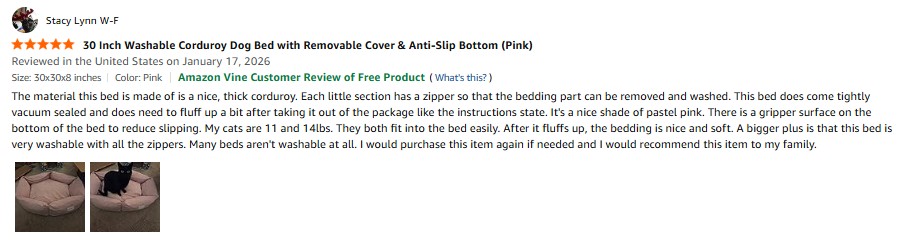 I purchased the Petinstinct Medium Dog Bed, 30 Inch Washable Corduroy Dog Bed with Removable Cover & Anti-Slip Bottom , Durable Comfort for Medium to Large Dogs up to 45 lbs (Pink) from Amazon and it was delivered in a timely fashion. The material this bed is made of is a nice, thick corduroy. Each little section has a zipper so that the bedding part can be removed and washed. This bed does come tightly vacuum sealed and does need to fluff up a bit after taking it out of the package like the instructions state. It’s a nice shade of pastel pink. There is a gripper surface on the bottom of the bed to reduce slipping. My cats are 11 and 14lbs. They both fit into the bed easily. After it fluffs up, the bedding is nice and soft. A bigger plus is that this bed is very washable with all the zippers. Many beds aren’t washable at all. I would purchase this item again if needed and I would recommend this item to my family. amazon listing.