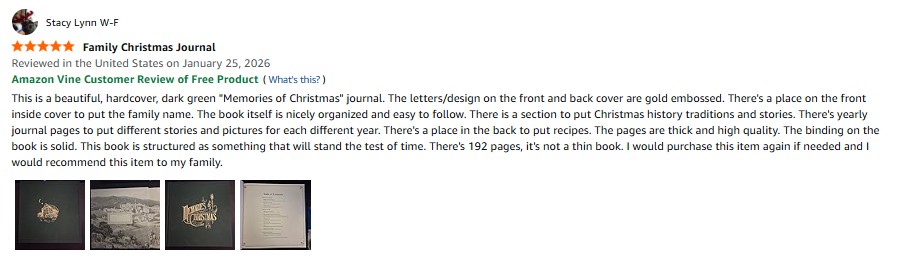 I purchased the Beating 50 Percent Family Christmas Journal – 25 Year Memories of Christmas Memory Book to Record Holiday Traditions, Gifts, Recipes & Photos – Family Heirloom Keepsake or Gift for Future Generations from Amazon and it was delivered in a timely fashion. This is a beautiful, hardcover, dark green “Memories of Christmas” journal. The letters/design on the front and back cover are gold embossed. There’s a place on the front inside cover to put the family name. The book itself is nicely organized and easy to follow. There is a section to put Christmas history traditions and stories. There’s yearly journal pages to put different stories and pictures for each different year. There’s a place in the back to put recipes. The pages are thick and high quality. The binding on the book is solid. This book is structured as something that will stand the test of time. There’s 192 pages, it’s not a thin book. I would purchase this item again if needed and I would recommend this item to my family. amazon listing.