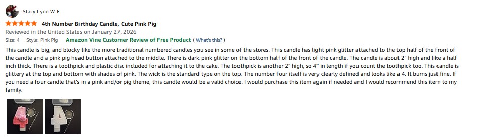 I purchased the ToonGlow 4th Number Birthday Candle, Cute Pink Pig Cake Topper with Sparkly Finish , Birthday Cake Decoration for Party Celebrations (Pink Pig, 4) from Amazon and it was delivered in a timely fashion. This candle is big, and blocky like the more traditional numbered candles you see in some of the stores. This candle has light pink glitter attached to the top half of the front of the candle and a pink pig head button attached to the middle. There is dark pink glitter on the bottom half of the front of the candle. The candle is about 2″ high and like a half inch thick. There is a toothpick and plastic disc included for attaching it to the cake. The toothpick is another 2″ high, so 4″ in length if you count the toothpick too. This candle is glittery at the top and bottom with shades of pink. The wick is the standard type on the top. The number four itself is very clearly defined and looks like a 4. It burns just fine. If you need a four candle that’s in a pink and/or pig theme, this candle would be a valid choice. I would purchase this item again if needed and I would recommend this item to my family. amazon listing.