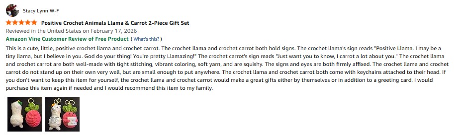 I purchased the HONEYSHOW Positive Crochet Animals Llama & Carrot 2-Piece Gift Set, Handmade Inspirational Gifts with Emotional Support Pun Cards fo Birthday, Graduation, Women, Friends, Family from Amazon and it was delivered in a timely fashion. This is a cute, little, positive crochet llama and crochet carrot. The crochet llama and crochet carrot both hold signs. The crochet llama’s sign reads “Positive Llama. I may be a tiny llama, but I believe in you. God do your thing! You’re pretty Llamazing!” The crochet carrot’s sign reads “Just want you to know, I carrot a lot about you.” The crochet llama and crochet carrot are both well-made with tight stitching, vibrant coloring, soft yarn, and are squishy. The signs and eyes are both firmly affixed. The crochet llama and crochet carrot do not stand up on their own very well, but are small enough to put anywhere. The crochet llama and crochet carrot both come with keychains attached to their head. If you don’t want to keep this item for yourself, the crochet llama and crochet carrot would make a great gifts either by themselves or in addition to a greeting card. I would purchase this item again if needed and I would recommend this item to my family. amazon listing.